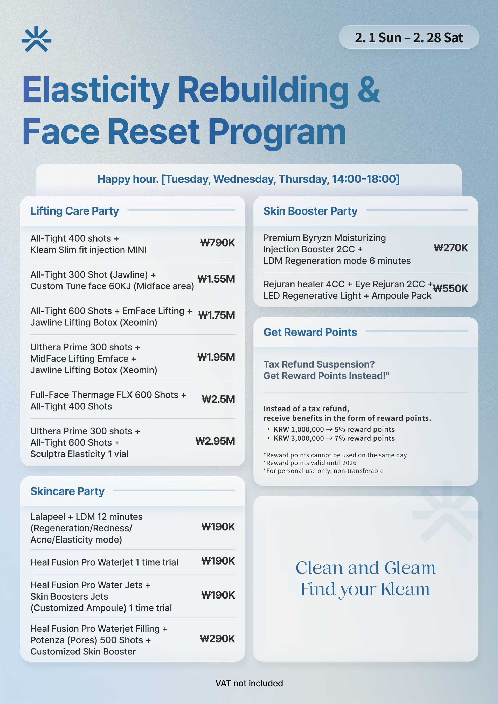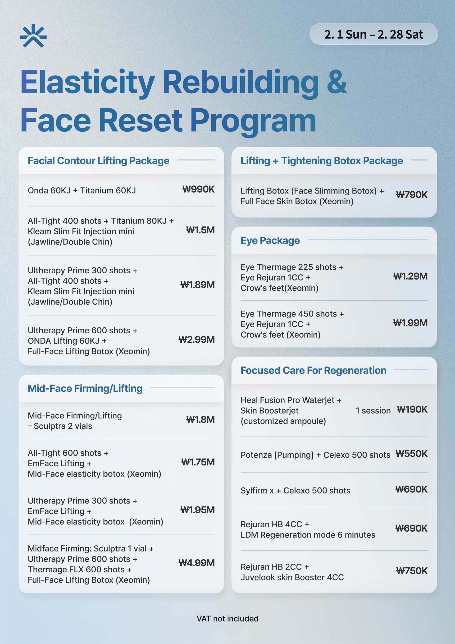 スキンバイブ、ラディエッセ、ウォーターグロウ注射、リジュランヒーラー、Qフェイシャル、LDM、ウォータードロップリフティングピール、エクソソーム(G-MPF)、ジュベルック、シャネル注射、バイタルインジェクター2、スキンブースタープロ、オキシジェンフェイシャル、LED光治療、鎮静ケア、保湿導入、ブライトニングフェイシャル、毛穴引き締め、ビタミンC点滴、抗酸化点滴、MTS+アンプル、ミルクピール、サーモンDNAブースター、ハーブピール、クライオフェイシャル、ジェットピール、韓国グラススキンフェイシャル など